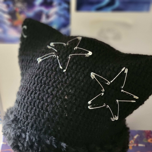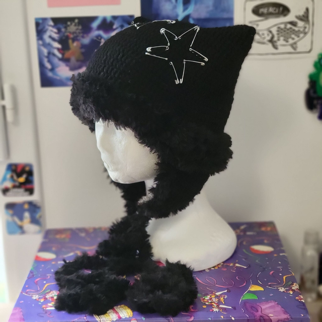 Bonnet chat noir avec un max d'épingles en forme d'étoiles avec des petits caches oreilles pour la chaleur et le style